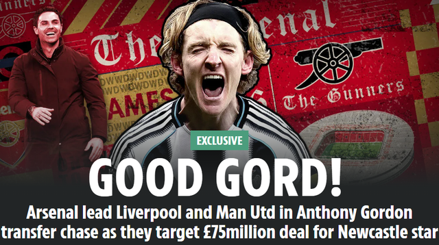 25岁的戈登,成为众多豪门追逐的目标。2月27日,《太阳报》透露,阿森纳、曼联、利物浦3大豪门,同时盯上戈登。纽卡给戈登的定价接近1亿英镑,这超过阿森纳的报价(7500-8000万英镑)。