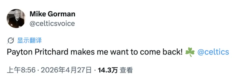 赛后,前凯尔特人解说员迈克-戈尔曼更新个人推特写道:“佩顿-普里查德让我想复出了!☘️ @凯尔特人”